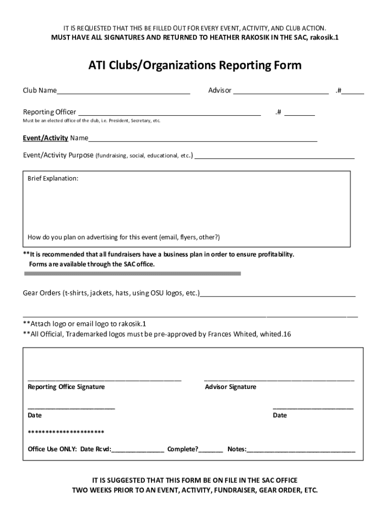 IT IS REQUESTED THAT THIS BE FILLED OUT FOR EVERY EVENT, ACTIVITY, AND CLUB ACTION.MUST HAVE ALL SIGNATURES AND RETURNED TO HEATHER RAMOS IN THE SAC, arkosic.1ATI Clubs/Organizations Reporting Form