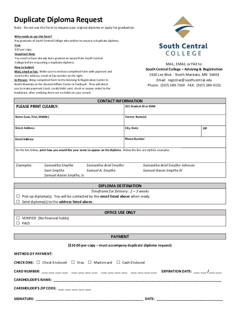 Duplicate Diploma Request Note: Do not use this form to request your original diploma or apply for graduation. Who needs to use this form? Any graduate of South Central College who wishes to request