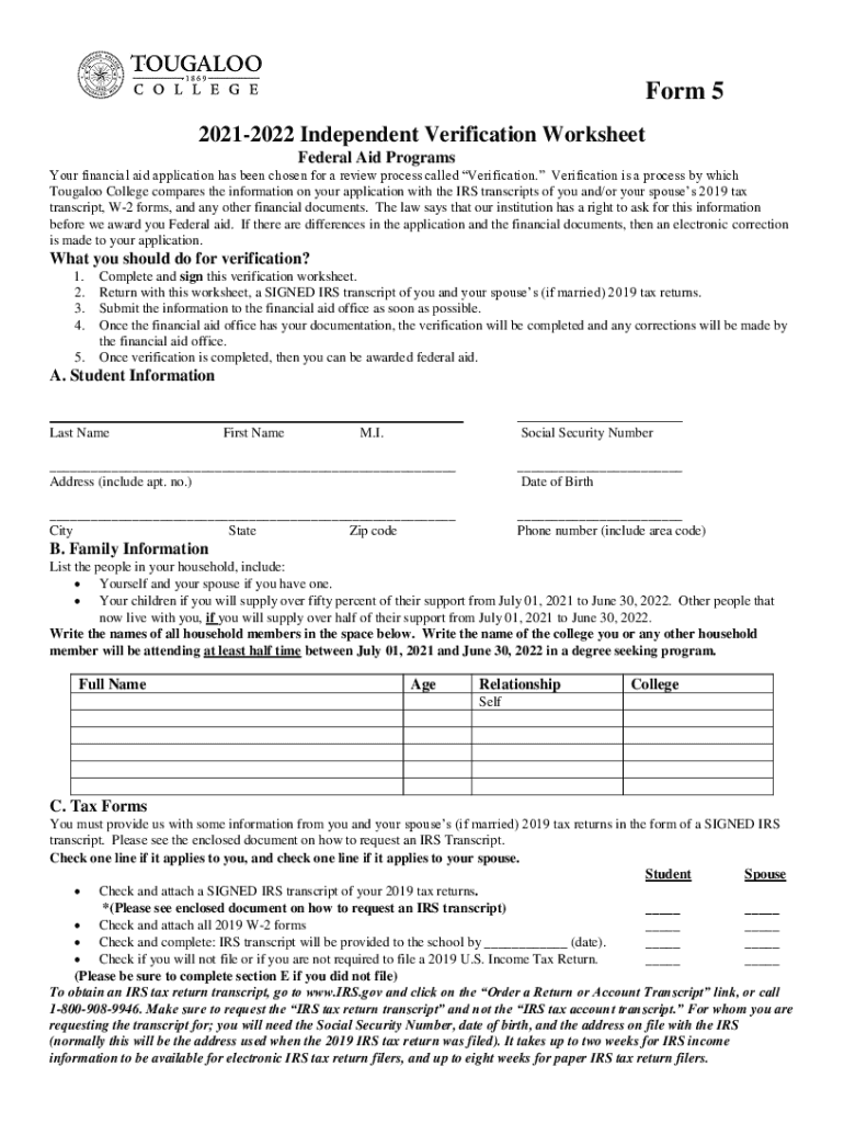Get the free 2021-2022 V5 Independent Verification Worksheet has been ...