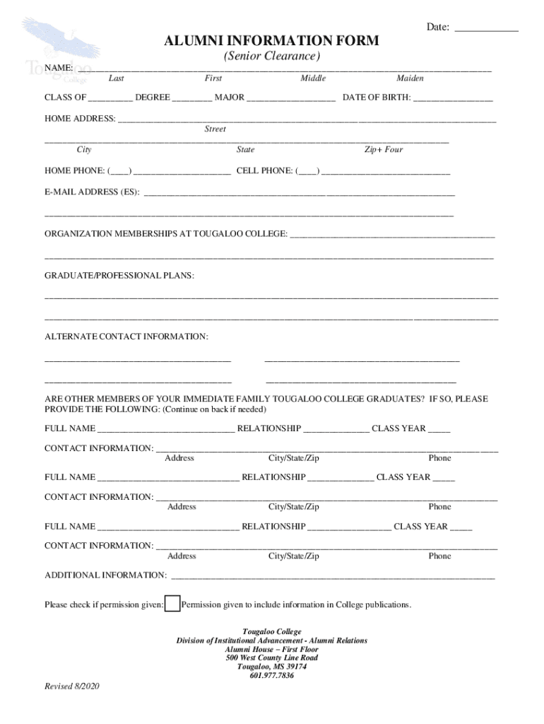Date: ALUMNI INFORMATION FORM (Senior Clearance) NAME: Last First Middle Maiden CLASS OF DEGREE MAJOR DATE OF BIRTH: HOME ADDRESS: Street City State Zip+ Four HOME PHONE: () CELL PHONE: () EMAIL ADDRESS