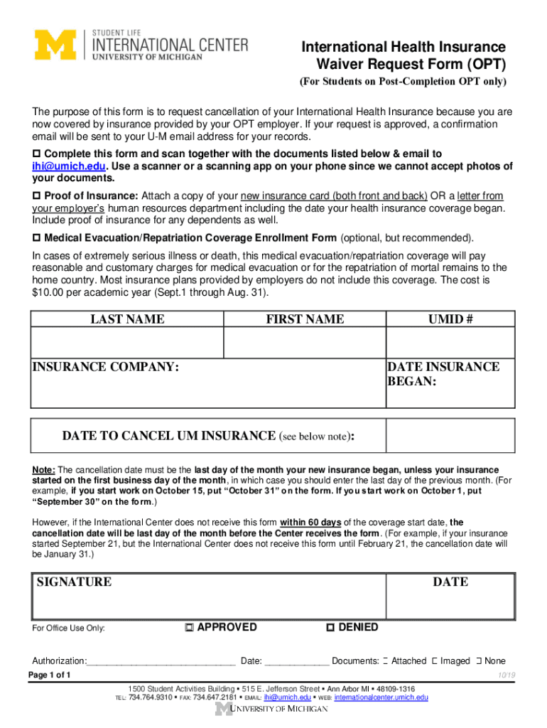 International Health Insurance Waiver Request Form (OPT) (For Students on PostCompletion OPT only) The purpose of this form is to request cancellation of your International Health Insurance because