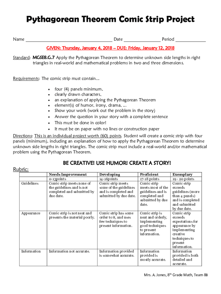 Pythagorean Theorem Comic Strip Project Name Date Period GIVEN: Thursday, January 4, 2018, DUE: Friday, January 12, 2018, Standard: MGSE8. G.7 Apply the Pythagorean Theorem to determine unknown side