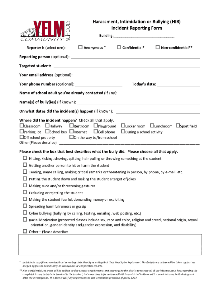 Harassment, Intimidation or Bullying (HIS) Incident Reporting Form Building: Reporter is (select one): Anonymous * Confidential* Nonconfidential**Reporting person (optional): Targeted student: Your