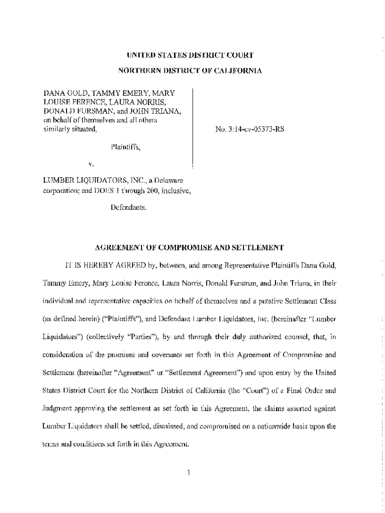 UNITED STATES DISTRICT COURT NORTHERN DISTRICT OF CALIFORNIAN GOLD, TAMMY EMERY, MARY LOUISE TERENCE, LAURA NORRIS, DONALD FURMAN, and JOHN TRINA, on behalf of themselves and all others similarly