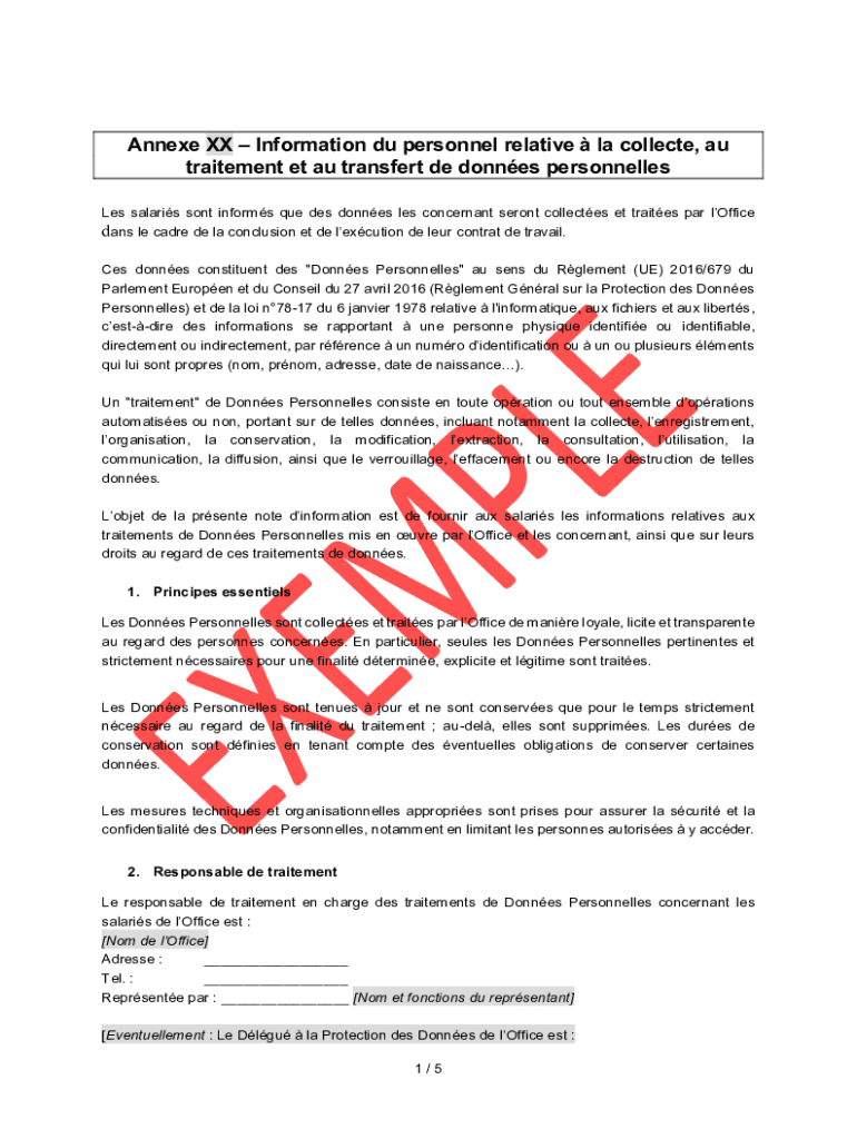 Annexed XX Information Du personnel relative la collected, AU treatment et AU transfer DE donnés personnel Les salaries sent informs Que DES donnés LES concern ant second collect set traits par