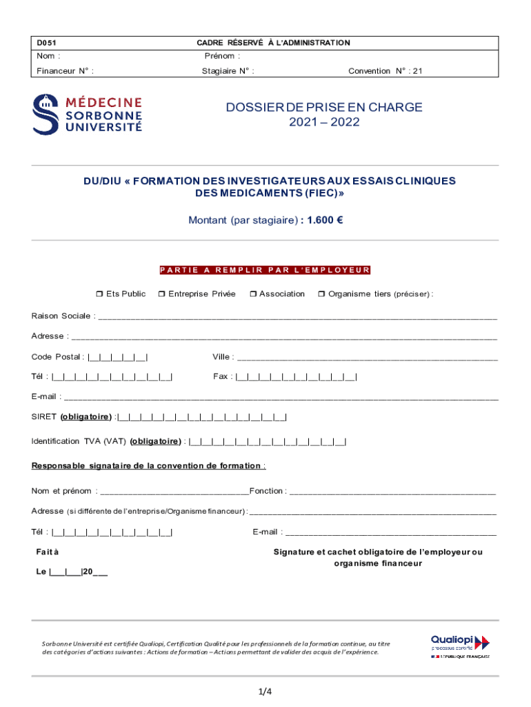 D051CADRE RS ERV LADMINISTRATIONNom :Prom :Finance N :Staggered N :Convention N : 21DOSSIER DEP RISE EN CHARGE 2021 2022DU/DID FORMATION DES INVESTIGATE URS AUX ESSAYS CLINIQUE DES MEDICAMENT (IEC)