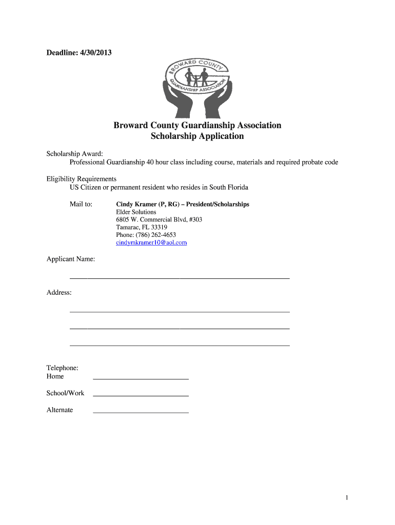 Deadline: 4/30/2013. 1. Broward County Guardianship Association. Scholarship Application. Scholarship Award: Professional Guardianship 40 hour class ...