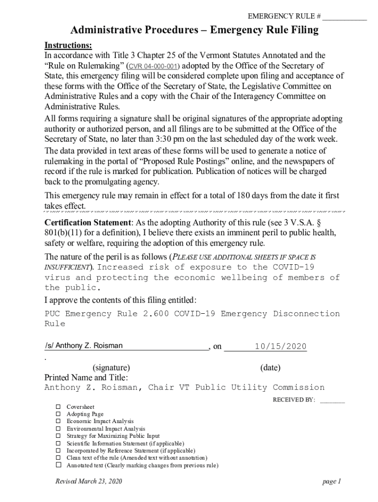 EMERGENCY RULE # Administrative Procedures Emergency Rule Filing Instructions: In accordance with Title 3 Chapter 25 of the Vermont Statutes Annotated and the Rule on Rule making (CVR 04000001) adopted