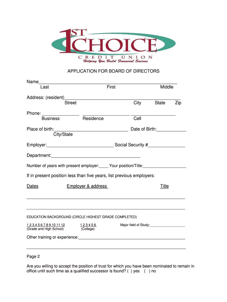 Get the free APPLICATION FOR BOARD OF DIRECTORS - 1stchoicecu