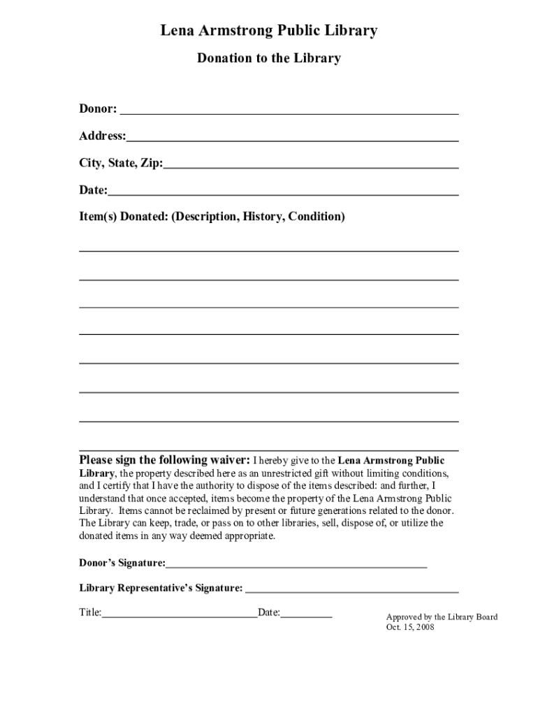Lena Armstrong Public Library Donation to the Library Donor: Address: City, State, Zip: Date: Item(s) Donated: (Description, History, Condition)Please sign the following waiver: I hereby give to the