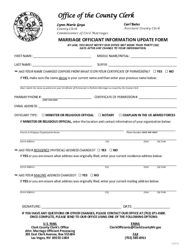 Office of the County Clerk Carl Bates Assistant County Clerk Lynn Marie Goya County Clerk Commissioner of Civil MarriagesMARRIAGE OFFICIANT INFORMATION UPDATE FORM BY LAW, YOU MUST NOTIFY OUR OFFICE