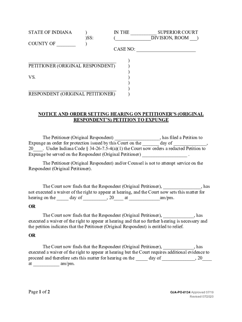 STATE OF INDIANA COUNTY OF))SS:)IN THE SUPERIOR COURT (DIVISION, ROOM) CASE NO: PETITIONER (ORIGINAL RESPONDENT) VS. RESPONDENT (ORIGINAL PETITIONER))))))))NOTICE AND ORDER SETTING HEARING ON PETITIONERS