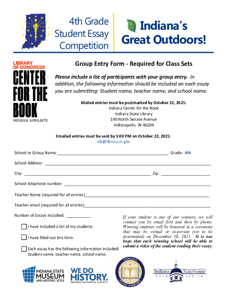 4th Grade Student Essay CompetitionIndianas Great Outdoors! Group Entry Form Required for Class Sets Please include a list of participants with your group entry. In addition, the following information
