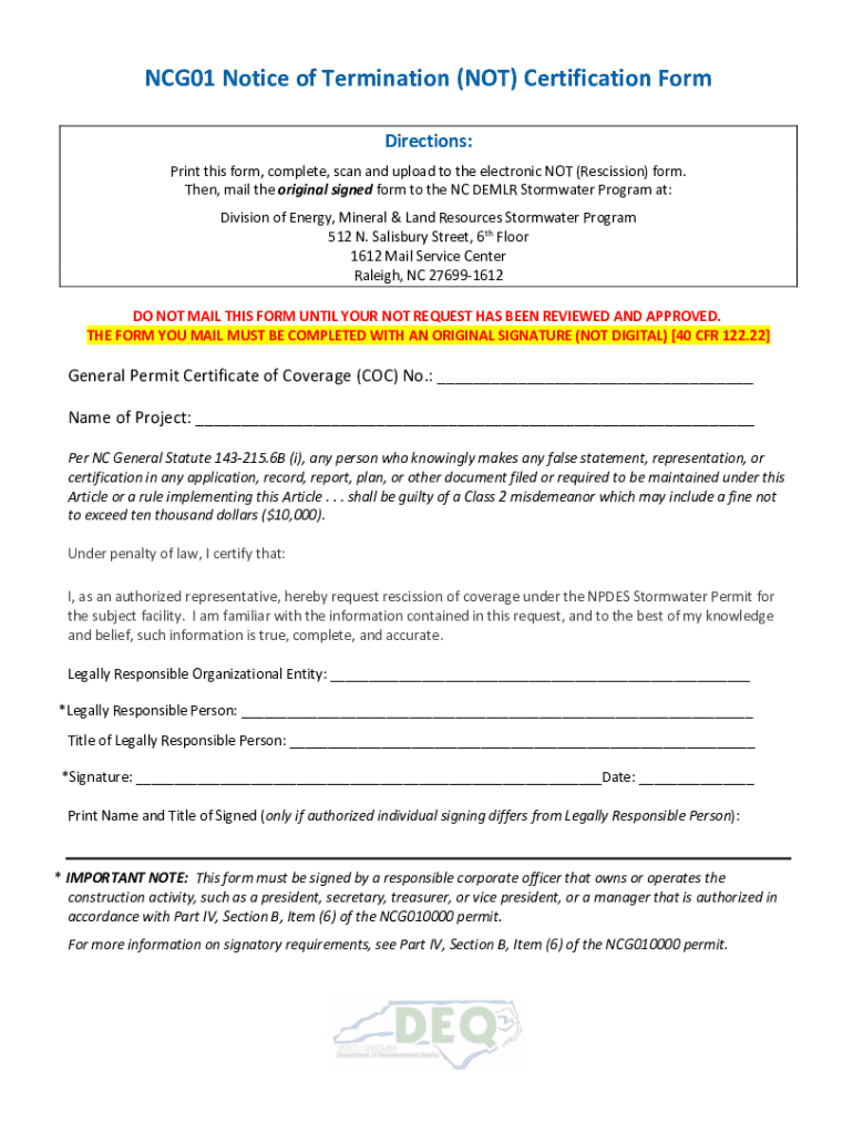 NCG01 Notice of Termination (NOT) Certification Form Directions: Print this form, complete, scan and upload to the electronic NOT (Rescission) form. Then, mail the original signed form to the NC DEMUR