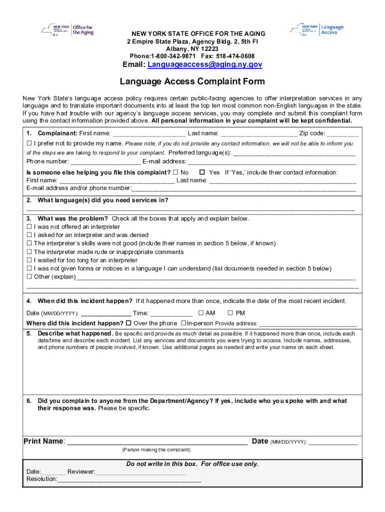 NEW YORK STATE OFFICE FOR THE AGING 2 Empire State Plaza, Agency Bldg. 2, 5th Fl Albany, NY 12223 Phone:18003429871 Fax: 5184740608Email: Languageaccess@aging.ny.govLanguage Access Complaint Form
