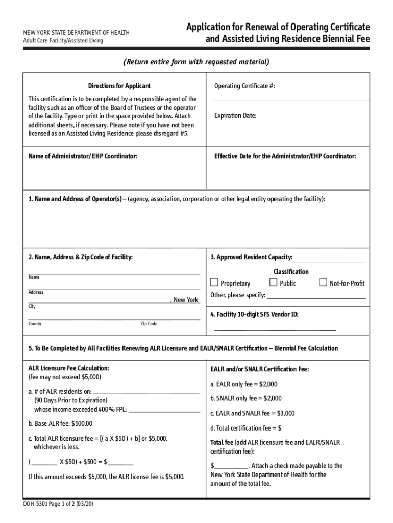 Application for Renewal of Operating Certificate and Assisted Living Residence Biennial Feeder YORK STATE DEPARTMENT OF HEALTH Adult Care Facility/Assisted Living(Return entire form with requested