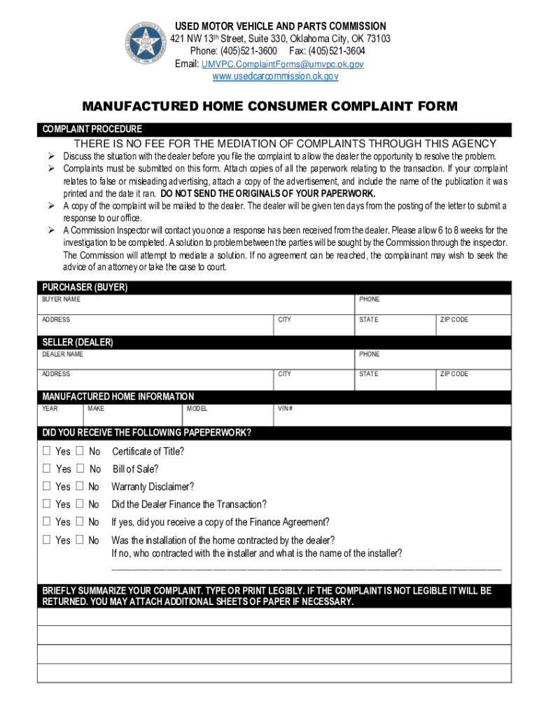 USED MOTOR VEHICLE AND PARTS COMMISSION 421 NW 13th Street, Suite 330, Oklahoma City, OK 73103 Phone: (405)5213600 Fax: (405)5213604 Email: UMVPC.ComplaintForms@umvpc.ok.gov www.usedcarcommission.ok.govMANUFACTURED