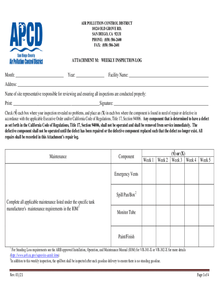 AIR POLLUTION CONTROL DISTRICT 10124 OLD GROVE RD. SAN DIEGO, CA 92131 PHONE: (858) 5862600 FAX: (858) 5862601ATTACHMENT M: WEEKLY INSPECTION Longmont: Year: Facility Name: Address: Name of site representative