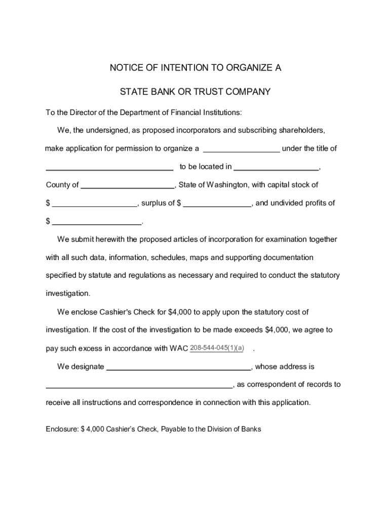 Get the free NOTICE OF INTENTION TO ORGANIZE A STATE BANK OR TRUST COMPANY - dfi wa