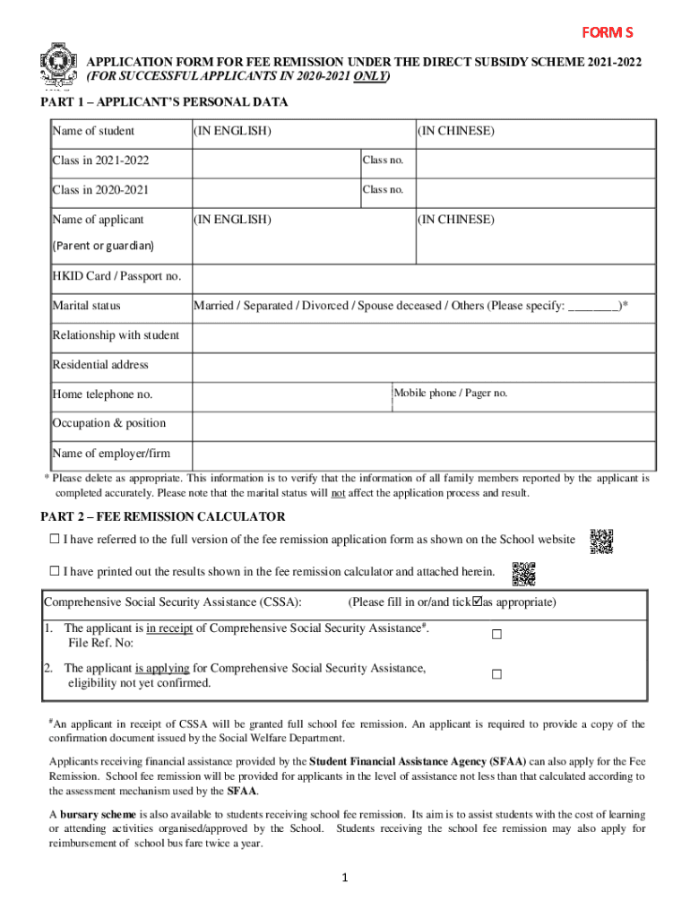 FORM S APPLICATION FORM FOR FEE REMISSION UNDER THE DIRECT SUBSIDY SCHEME 20212022 (FOR SUCCESSFUL APPLICANTS IN 20202021 ONLY) PART 1 APPLICANTS PERSONAL DATA Name of student(IN ENGLISH)(IN CHINESE)Class