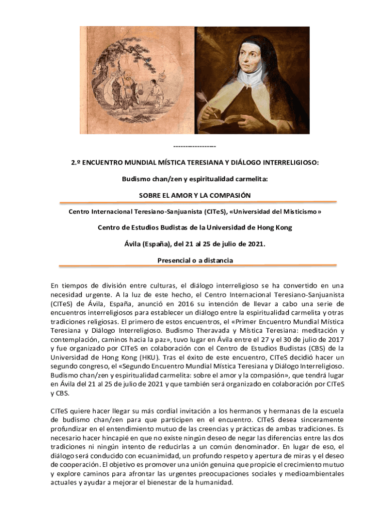 2. ENCUENTRO SUNDIAL MST ICA TERESINA Y DI LOGO INTERRELIGIOUS: Nudism Chan/zen y despiritualized Carmela: SORE EL ARMOR Y LA COMPASS N CENTR International TeresianoSanjuanista (Cites), Universidad