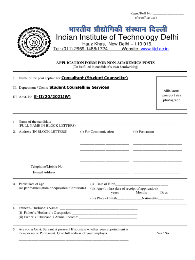 Reign./Roll No. (for office use)Indian Institute of Technology Delhi Haul Has, New Delhi 110 016. Tel: (011) 26591488/1724 Website :www.iitd.ac.in APPLICATION FORM FOR NONACADEMIC POSTS (To be filled