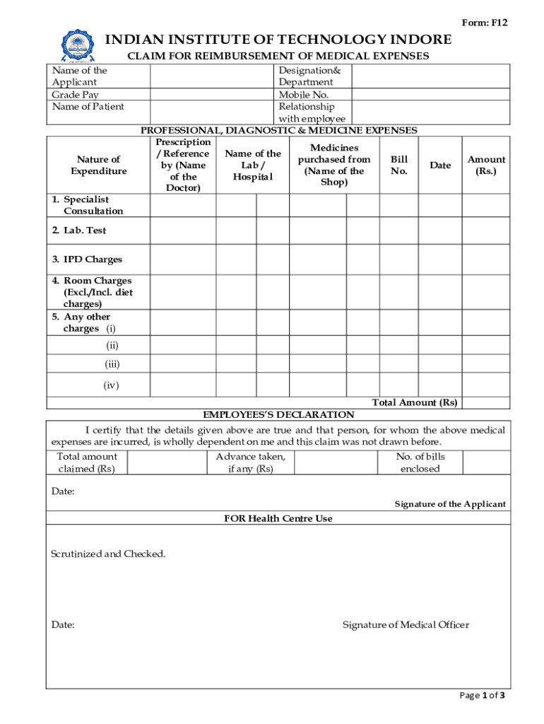 Form: F12INDIAN INSTITUTE OF TECHNOLOGY INDORE CLAIM FOR REIMBURSEMENT OF MEDICAL EXPENSES Name of the Applicant Grade Pay Name of PatientNature of ExpenditureDesignation& Department Mobile No. Relationship