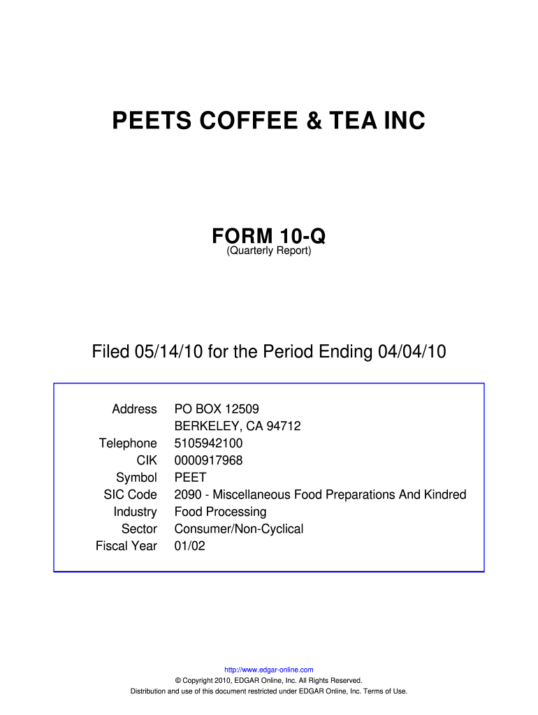 MEETS COFFEE & TEA INC FORM Report) 10-Q (Quarterly Filed 05/14/10 for the Period Ending 04/04/10 Address Telephone CIK Symbol SIC Code Industry Sector Fiscal Year PO BOX 12509 BERKELEY, CA 94712