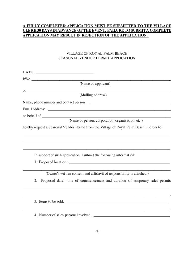 A FULLY COMPLETED APPLICATION MUST BE SUBMITTED TO THE VILLAGE CLERK 30 DAYS IN ADVANCE OF THE EVENT. FAILURE TO SUBMIT A COMPLETE APPLICATION MAY RESULT IN REJECTION OF THE APPLICATION.VILLAGE OF