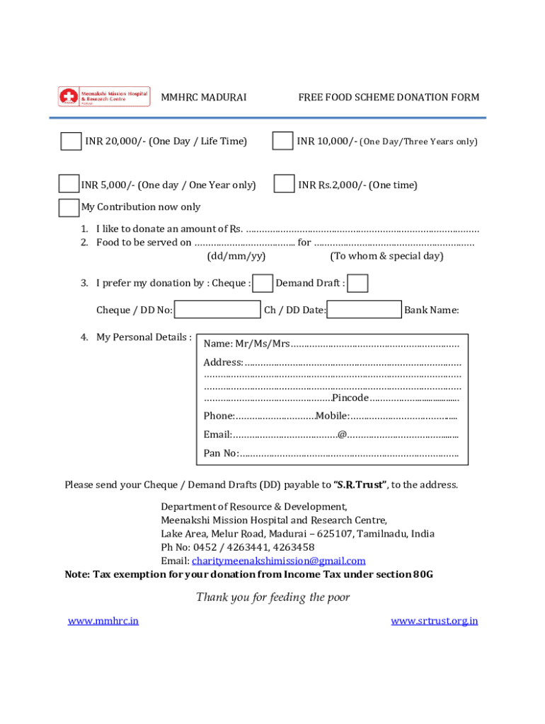 MM HRC MADURAIFREE FOOD SCHEME DONATION FORMING 20,000/ (One Day / Life Time)INR 10,000/ (One Day/Three Years only)INR 5,000/ (One day / One Year only)INR Rs.2,000/ (One time)My Contribution now only