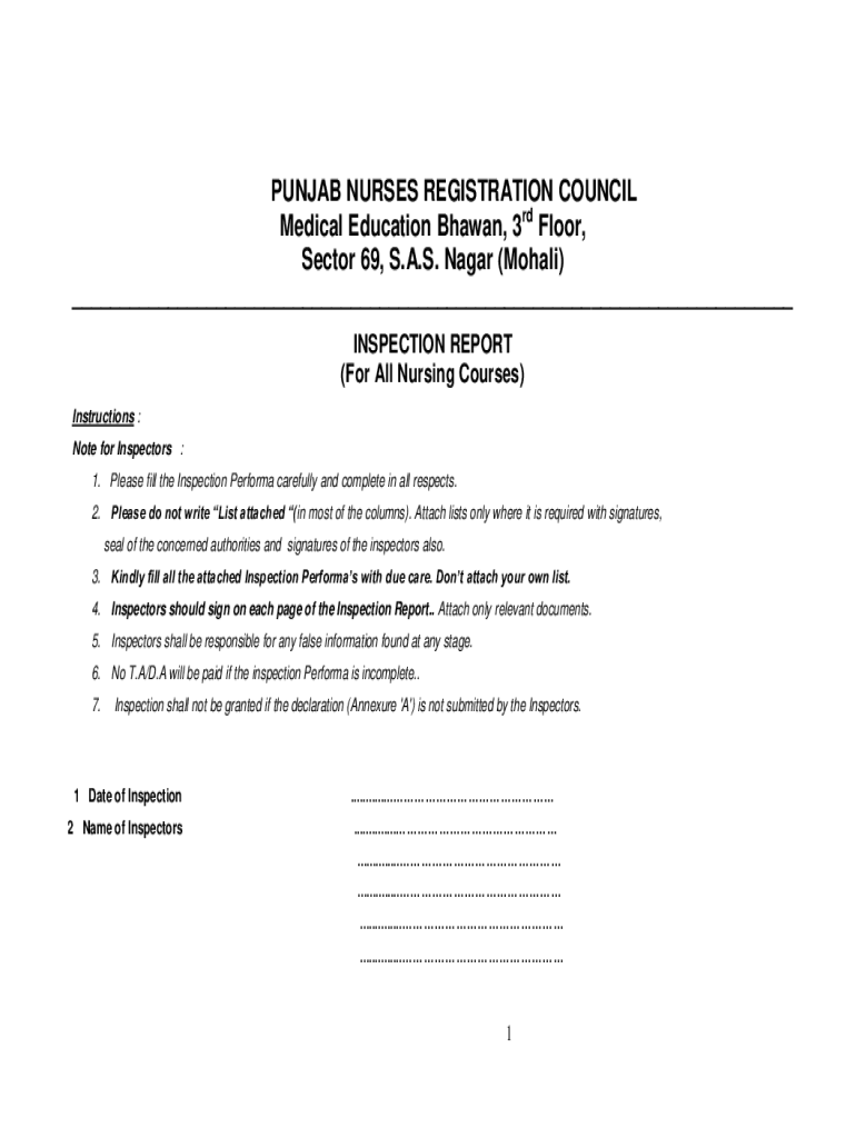 PUNJAB NURSES REGISTRATION COUNCIL Medical Education Shawn, 3rd Floor, Sector 69, S.A.S. Nagar (Moral) INSPECTION REPORT (For All Nursing Courses) Instructions : Note for Inspectors : 1. Please fill