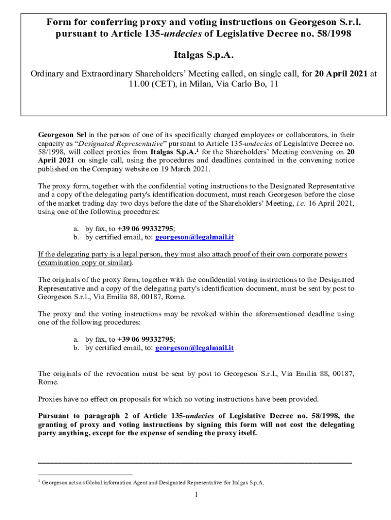Form for conferring proxy and voting instructions on George son S.r.l. pursuant to Article 135undecies of Legislative Decree no. 58/1998 Ital gas S.p.A. Ordinary and Extraordinary Shareholders Meeting