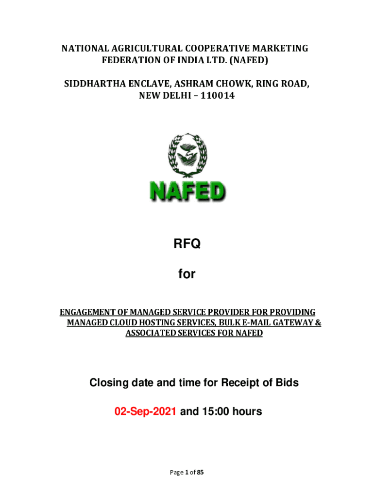 NATIONAL AGRICULTURAL COOPERATIVE MARKETING FEDERATION OF INDIA LTD. (NAMED) SIDDHARTHA ENCLAVE, ASHRAM CHOW, RING ROAD, NEW DELHI 110014RFQ for ENGAGEMENT OF MANAGED SERVICE PROVIDER FOR PROVIDING