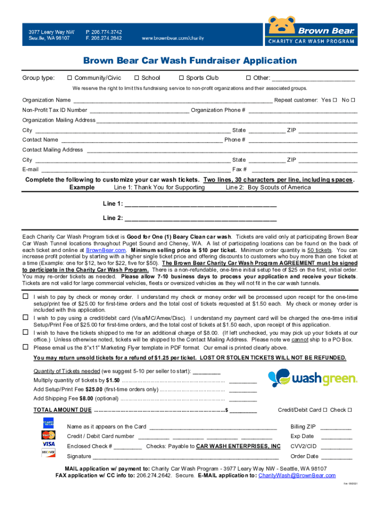 Brown Bear Car Wash Fundraiser Application Group type: Community/Civic School Sports Club Other: We reserve the right to limit this fundraising service to nonprofit organizations and their associated