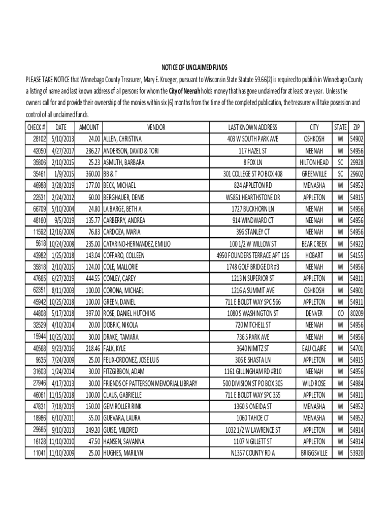 NOTICE OF UNCLAIMED FUNDS PLEASE TAKE NOTICE that Winnebago County Treasurer, Mary E. Krueger, pursuant to Wisconsin State Statute 59.66(2) is required to publish in Winnebago County a listing of