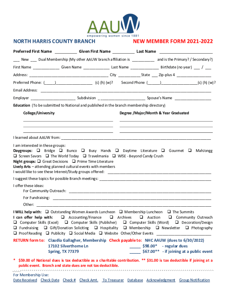 Get the free NORTH HARRIS COUNTY BRANCH NEW MEMBER FORM 2021-2022 - nharriscounty-tx aauw