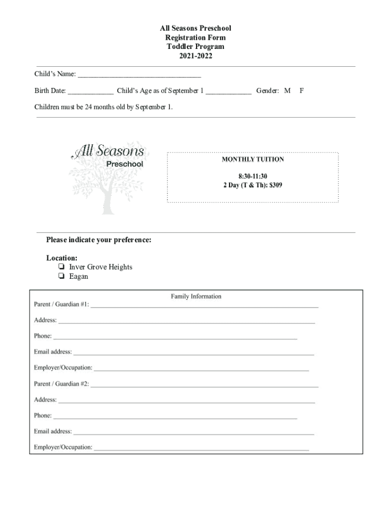 All Seasons Preschool Registration Form Toddler Program 20212022 Child's Name: Birth Date: Child's Age as of September 1 Gender: M Children must be 24 months old by September 1. Please indicate your