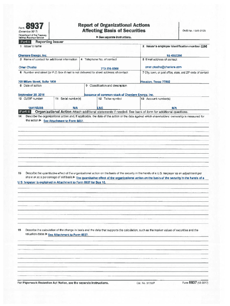 8937Report of Organizational Actions Affecting Basis of SecuritiesForm (December 2017) Department of the Treasury intern Revenue Service TI 13See separate instructions. ReportingIssuer 2 Issuers employer