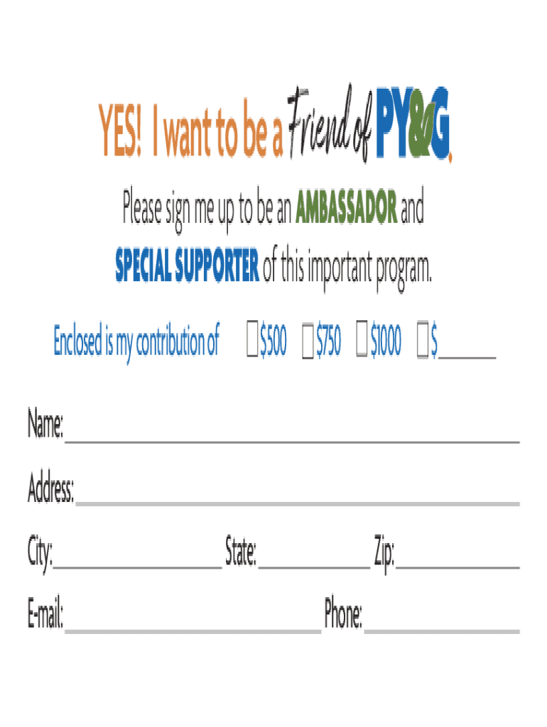 YES! I want to be a Friend please sign me up to be an AMBASSADOR and SPECIAL SUPPORTER of this important program. Enclosed is my contribution of Name: Address: City: Email:$$500750State:$1000Zip: