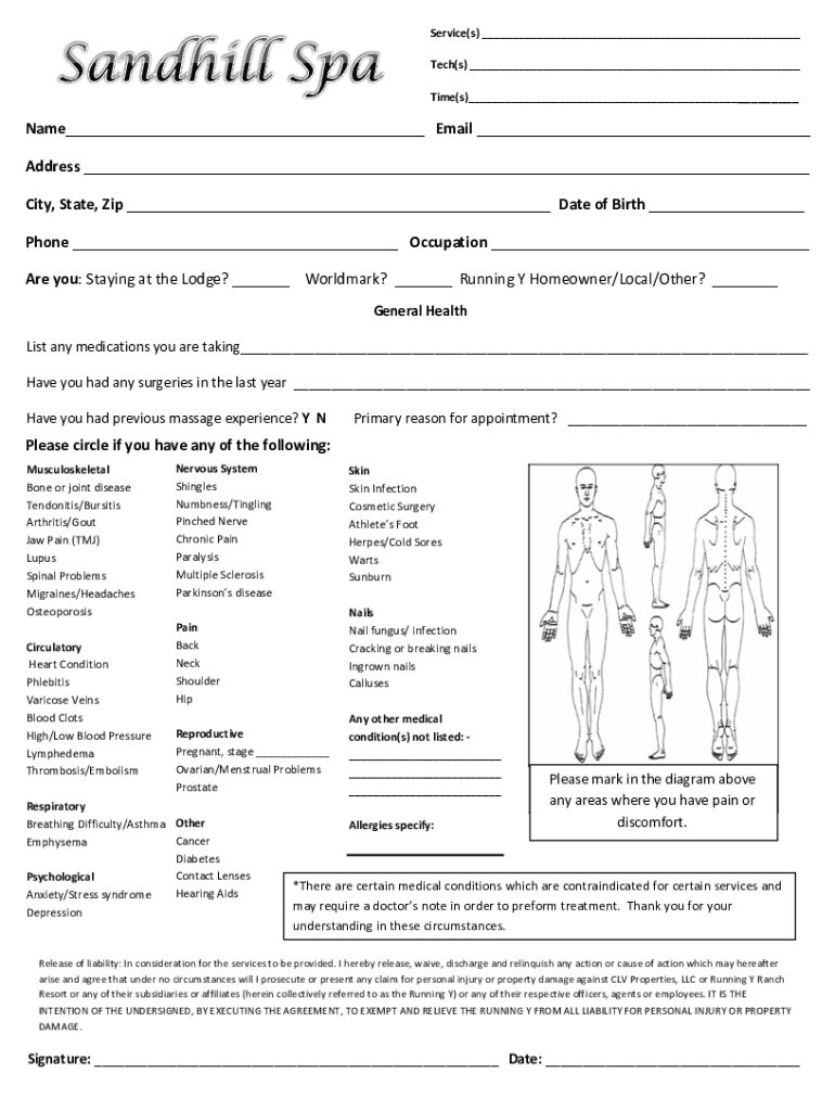 Service(s) Tech(s) Time(s) Name Email Address City, State, Zip Date of Birth Phone Occupation Are you: Staying at the Lodge? World mark? Running Y Homeowner/Local/Other? General Health List any medications