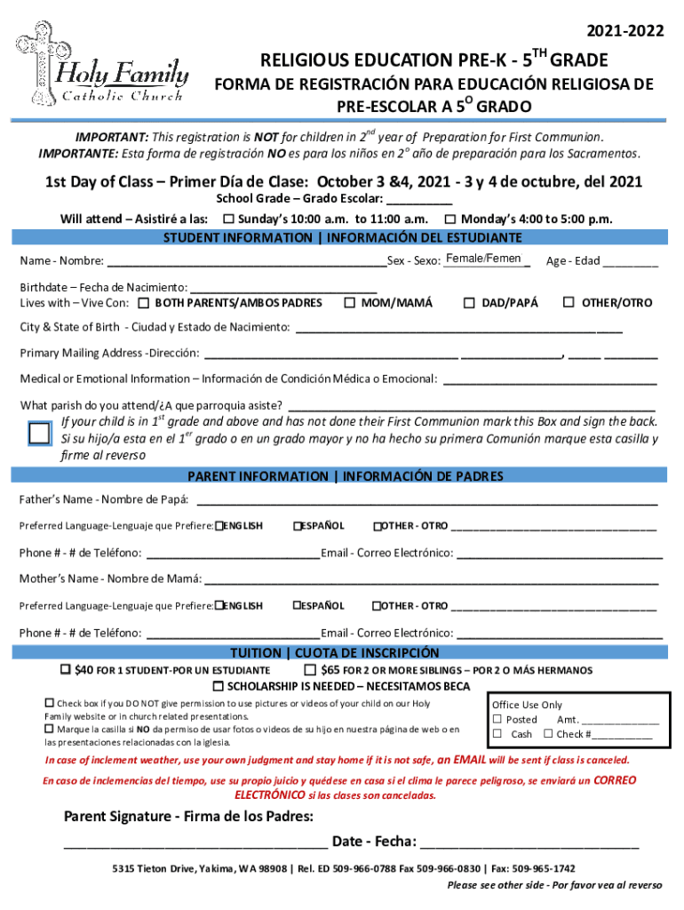 20212022RELIGIOUS EDUCATION PREY 5TH GRADE FORM DE REGISTRATION PARA EDUCATION RELIGIOUS DE PREMOLAR A 5O GRADE IMPORTANT: This registration is NOT for children in 2nd year of Preparation for First