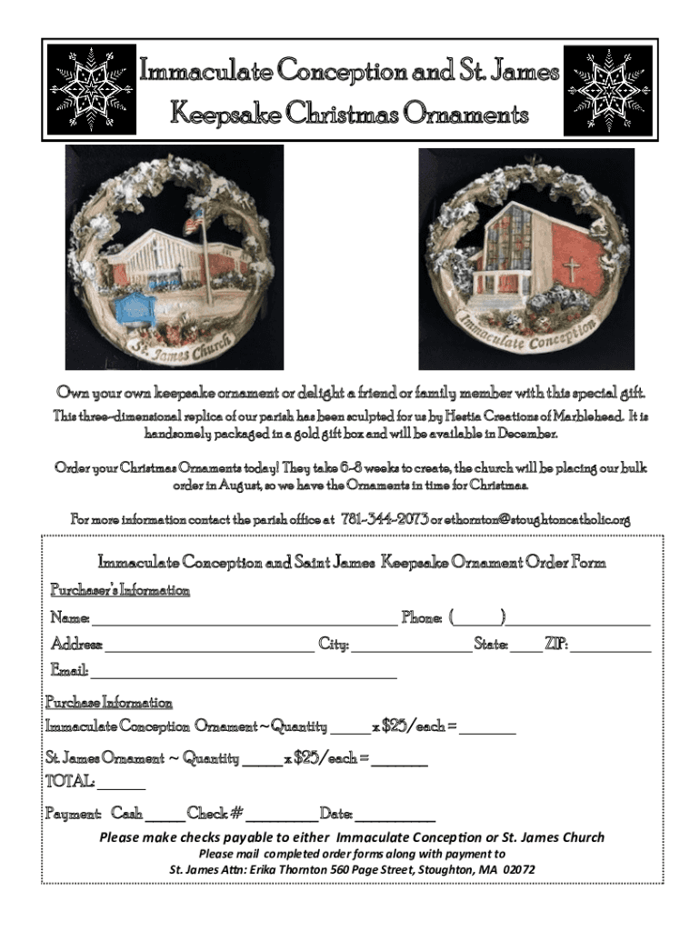 Immaculate Conception and St. James Keepsake Christmas Ornaments your own keepsake ornament or delight a friend or family member with this special gift. This three-dimensional replica of our parish