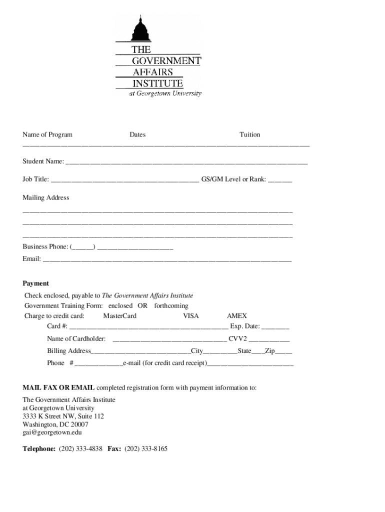 Name of Program Dates Tuition Student Name: Job Title: GS/GM Level or Rank: Mailing Address Business Phone: () Email: Payment Check enclosed, payable to The Government Affairs Institute Government