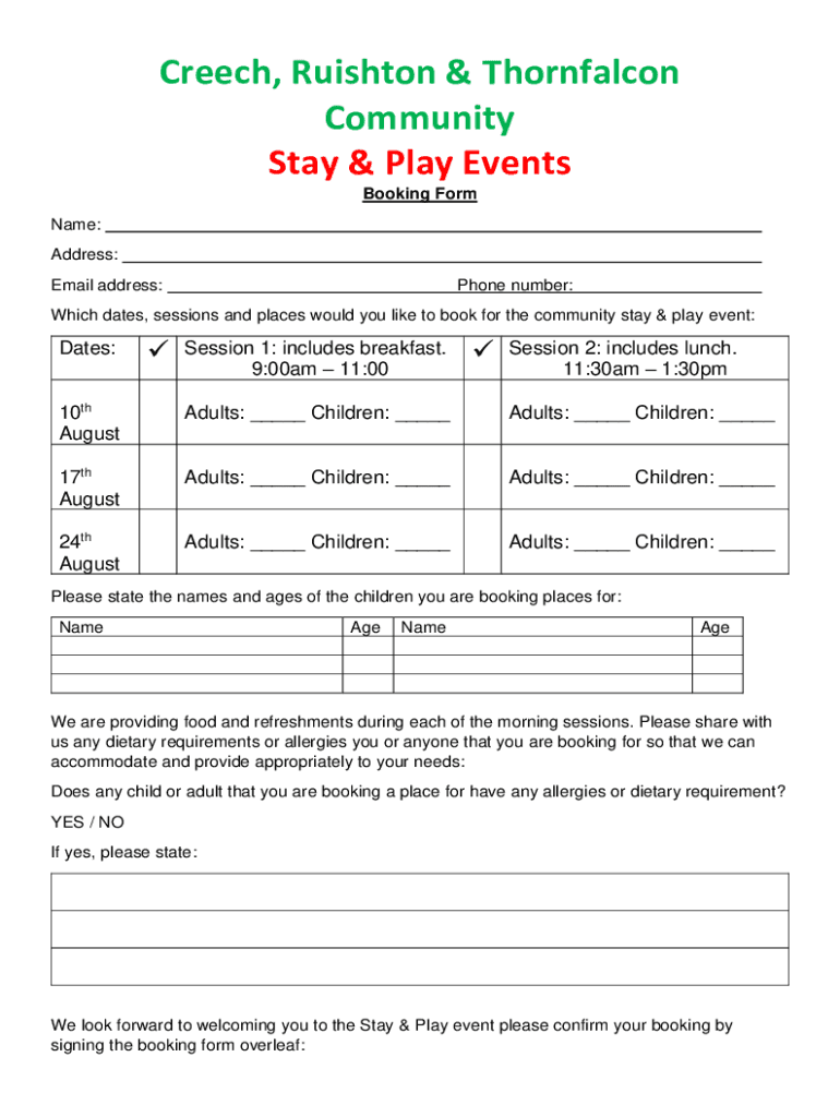 Breech, Brighton & Thorn falcon Community Stay & Play Events Booking Form Name: Address: Email address:Phone number:Which dates, sessions and places would you like to book for the community stay &