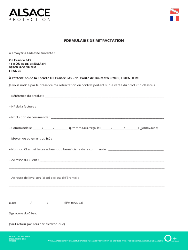 FORMULA IRE DE RETRACTION A envoy her lacrosse private : O+ France SAS 11 ROUTE DE BREATH 67800 BLENHEIM FRANCE attention DE la So cit O+ France SAS 11 Route de Brumath, 67800, BLENHEIM JE vows notified
