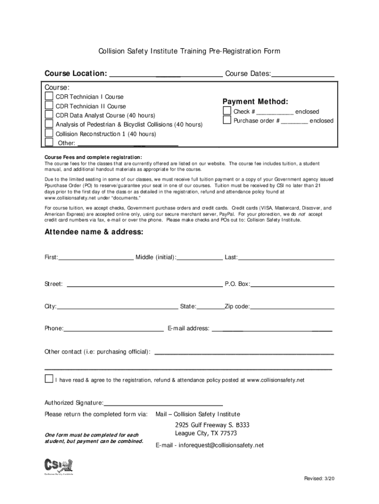 Collision Safety Institute Training Preregistration Form Course Location: Course Dates:Course: CDR Technician I Course CDR Technician II Course CDR Data Analyst Course (40 hours) Analysis of Pedestrian