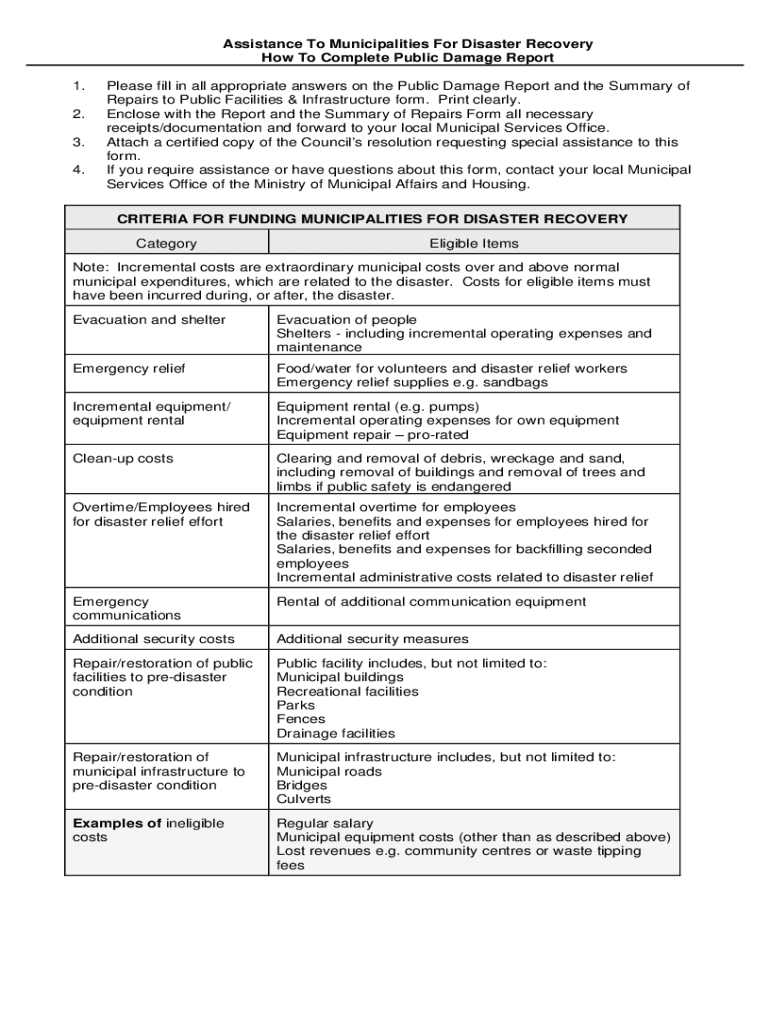 Assistance To Municipalities For Disaster Recovery How To Complete Public Damage Report 1. 2. 3. 4. Please fill in all appropriate answers on the Public Damage Report and the Summary of Repairs to