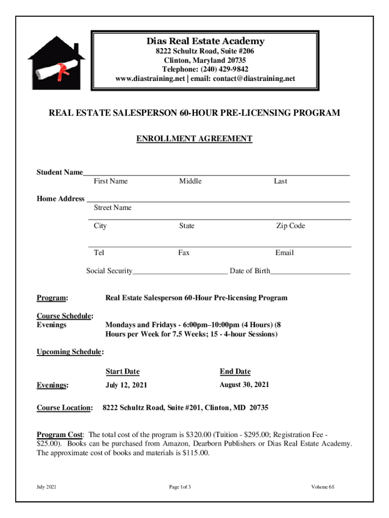 Dias Real Estate Academy 8222 Schultz Road, Suite #206 Clinton, Maryland 20735 Telephone: (240) 4299842 www.diastraining.net email: contact distraining. Neutral ESTATE SALESPERSON 60HOUR LICENSING