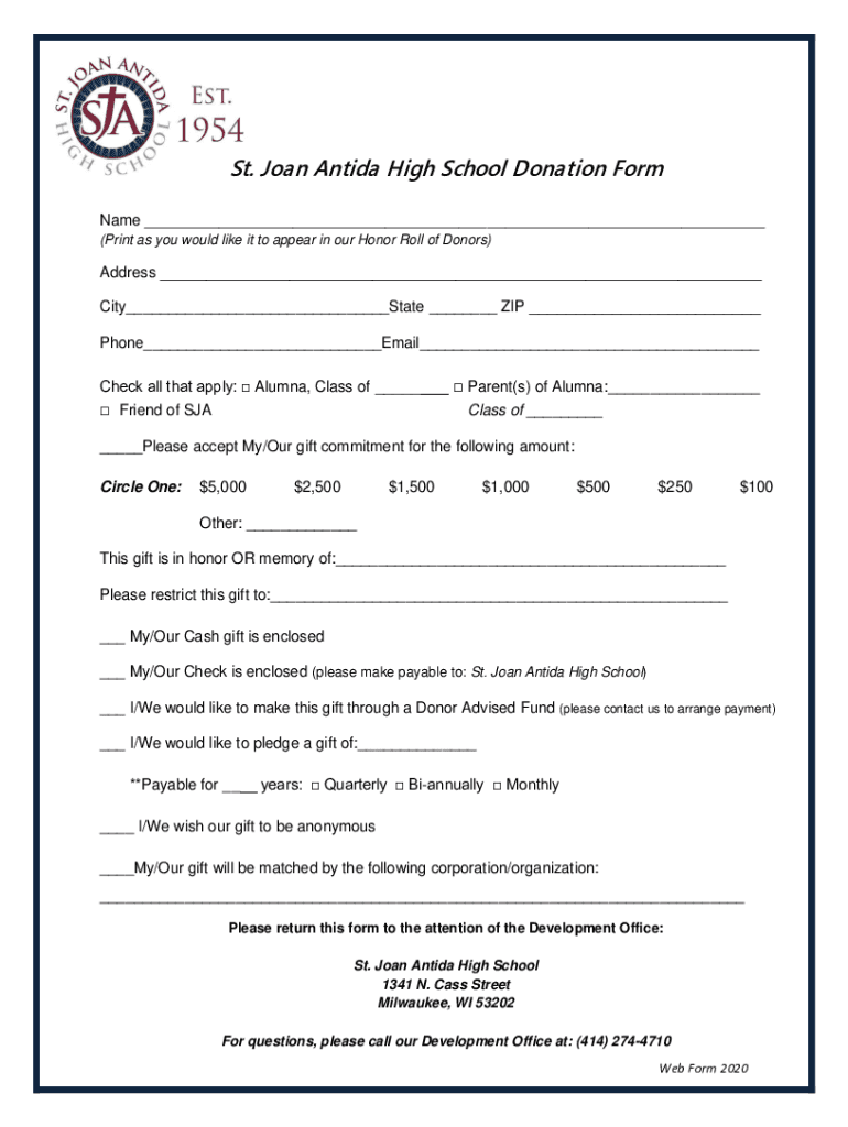 St. Joan Antifa High School Donation Form Name (Print as you would like it to appear in our Honor Roll of Donors)Address City State ZIP Phone Email Check all that apply: Alumna, Class of Parent(s)