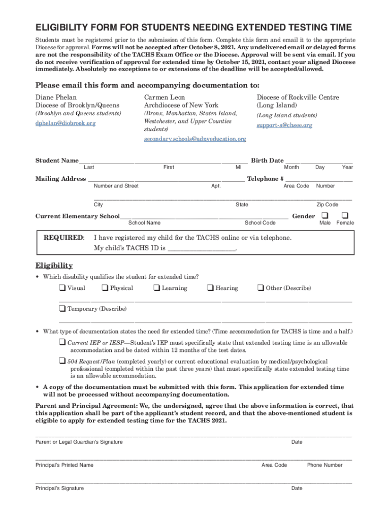 ELIGIBILITY FORM FOR STUDENTS NEEDING EXTENDED TESTING TIME Students must be registered prior to the submission of this form. Complete this form and email it to the appropriate Diocese for approval.